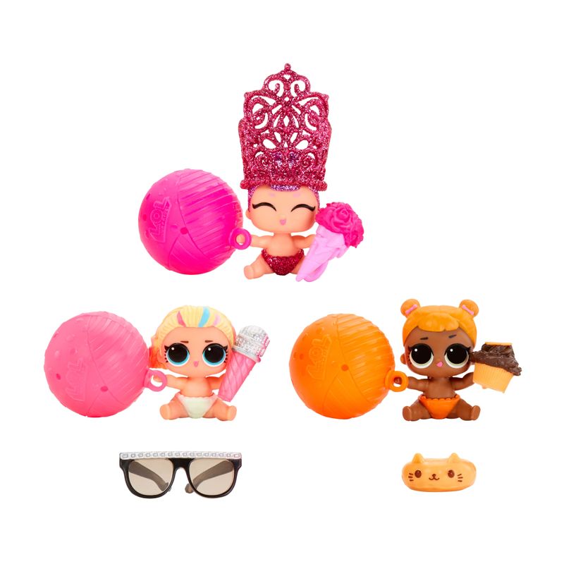 Cada Sooo Mini!™ L.O.L. Surprise Lil Sister inclui 5 surpresas: (1) Boneca Sooo Mini!™ L.O.L. Surprise! Lil Sisters™; (2) Sapatos; (3) Pingente; (4) Mini LOL Ball Unboxing; (5) Color Change Surprise™.