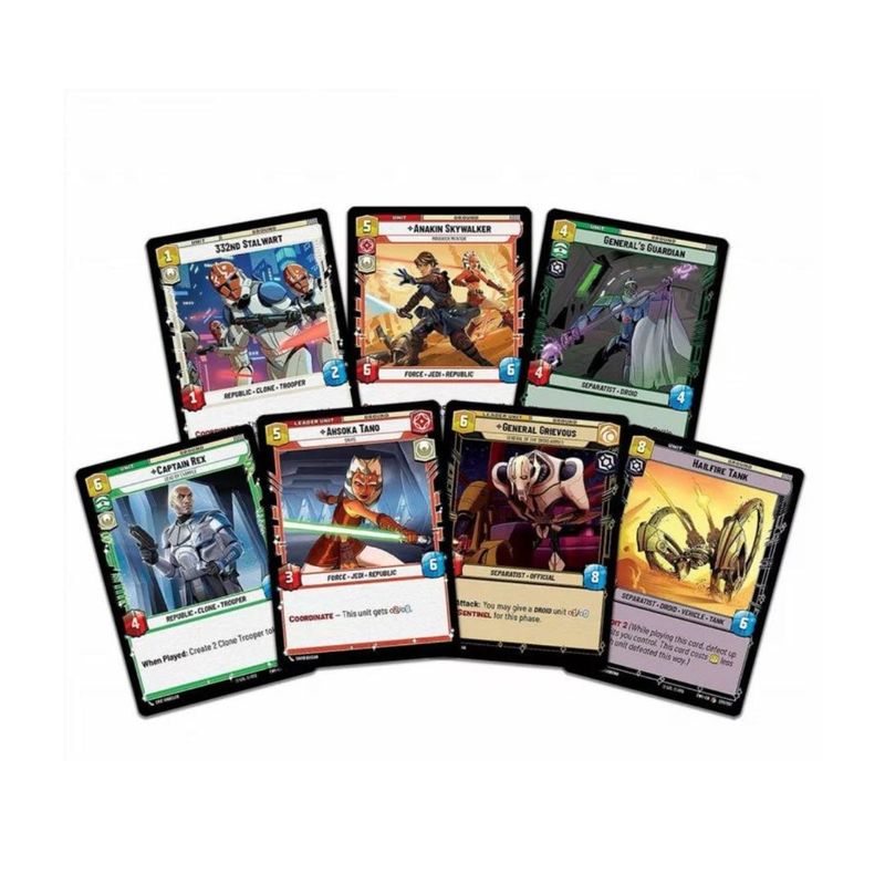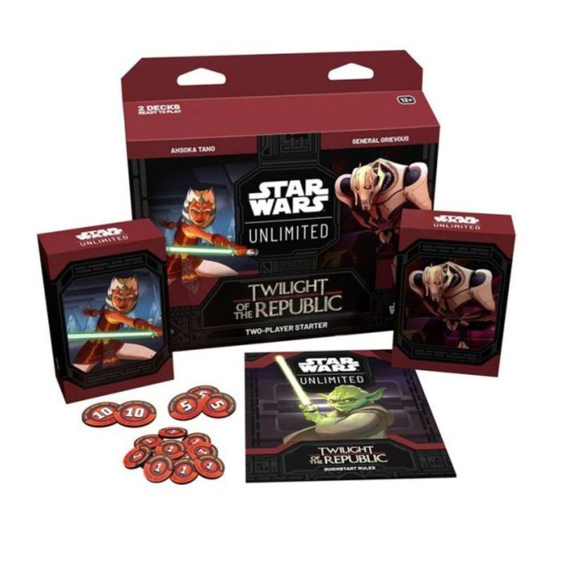 Em Two Player Starter do terceiro conjunto, Twilight of the Republic, você encontrará dois decks prontos para jogar, perfeitos para você e um amigo iniciarem sua jornada no jogo. Lidere ataques coordenados como Ahsoka Tano ou comande exércitos de droides sob o comando do General Grievous!