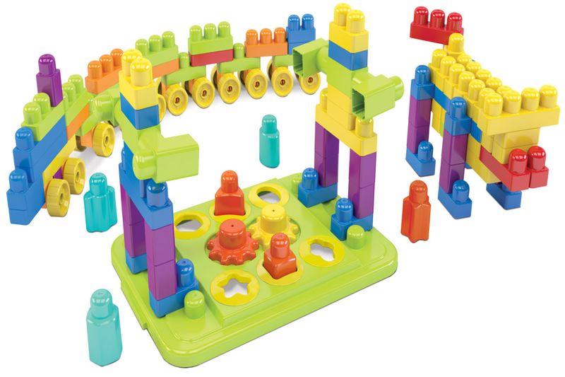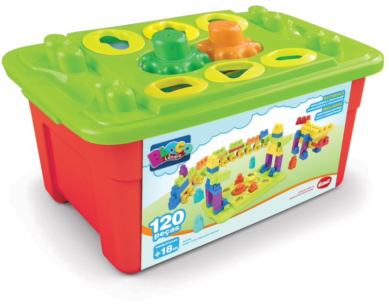 Contém: 1 tampa, 6 formas geométricas, 2 engrenages, 1 caixa, 6 pinos tronco, 18 pinos simples, 20 pinos triplos, 10 pinos com rodas, 40 pinos duplos e 10 pinos quádruplos.