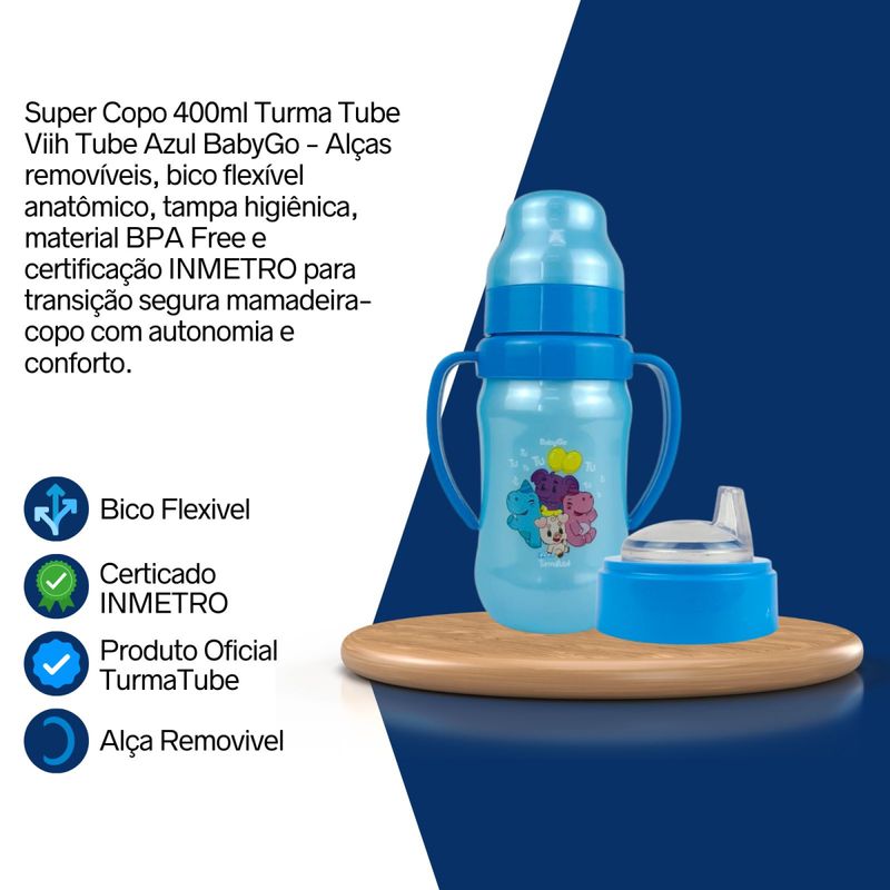 O Super Copo de Treinamento TurmaTube Viih Tube 400ml com alças e tampa higiênica foi desenvolvido para bebês que estão iniciando o processo de transição da mamadeira para o copo, proporcionando maior autonomia. Indicado a partir dos 6 meses, o copo possui tampa higiênica que mantém o bico sempre seguro e protegido contra contaminações. Seu bico flexível facilita a introdução de água, suco, leite e outras substâncias, e na fase de dentição garante mais durabilidade. Com alças removíveis ergonômicas, oferece melhor pegada para mãozinhas pequenas. Os personagens coloridos da Turma Tube da Viih Tube tornam o momento da hidratação mais atrativo e estimulam a autonomia de forma divertida. Principais Benefícios Capacidade aumentada 400ml - Volume maior ideal para crianças em desenvolvimento da autonomia Alças ergonômicas removíveis - Facilitam pegada e podem ser retiradas conforme criança cresce Tampa higiênica inclusa - Mantém bico protegido contra contaminações quando não está em uso Bico flexível resistente - Facilita introdução de líquidos e resiste melhor durante fase de dentição Design Turma Tube Viih Tube - Personagens coloridos que despertam interesse e estimulam hidratação Especificações Técnicas Capacidade: 400ml Dimensões: 18cm (altura) x 12cm (largura) x 7cm (comprimento) Peso: 109 gramas Material: Polipropileno 100% livre de BPA Personagens: Turma Tube da Viih Tube Faixa etária: Indicado a partir de 6 meses Características: Alças removíveis, bico flexível, tampa higiênica Acessórios: Tampa higiênica inclusa Certificações: INMETRO, BPA Free, livre de ftalatos Cuidados: Higienizar com produtos neutros após cada uso Perguntas Frequentes P: A partir de que idade posso usar este super copo? R: Indicado para bebês a partir de 6 meses, quando iniciam a transição da mamadeira para o copo. P: As alças podem ser removidas? R: Sim, as alças são removíveis, permitindo adaptar o copo conforme a criança desenvolve coordenação motora. P: O bico flexível é seguro para a dentição? R: Sim, o bico flexível foi desenvolvido para resistir à mordida durante a fase de dentição sem se danificar. P: Posso usar no microondas? R: Não é recomendável o uso em micro-ondas. Aqueça o líquido separadamente e depois coloque no copo. P: Como higienizar todos os componentes? R: Recomenda-se higienizar todos os componentes com produtos neutros após cada uso para maior segurança. Características Especiais Indicado a partir de 6 meses Material: Polipropileno livre de BPA para total segurança Alças removíveis: Adaptam-se ao desenvolvimento da coordenação motora infantil Bico flexível: Facilita introdução de líquidos e resiste à dentição Tampa higiênica: Protege contra contaminações Recomendações de Uso • Recomenda-se que, a cada uso, todos os componentes deste copo sejam higienizados com produtos neutros • Ao sinal de qualquer desgaste dos componentes do produto, substitua-o imediatamente • Não recomendável o uso em micro-ondas • Supervisione sempre o uso por crianças pequenas Garantia e Segurança Garantia: 90 dias do fabricante BabyGo contra defeitos de fabricação Certificações: INMETRO, BPA Free, livre de substâncias tóxicas Segurança: Materiais atóxicos testados e aprovados para uso infantil Política de troca: Até 7 dias para arrependimento conforme CDC Qualidade: Produto BabyGo com estampa resistente a lavagens Estoque limitado! Garante já o Super Copo de Treinamento Turma Tube Viih Tube 400ml para desenvolver a autonomia do seu bebê com segurança e diversão.