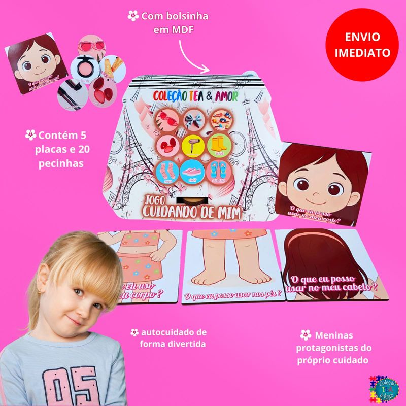 Composto por 5 placas ilustrativas e 20 pecinhas – cada placa representa uma parte do corpo (cabelo, rosto, corpo, pés e mais uma surpresa especial!) – o jogo convida a criança a explorar cada parte e os itens de cuidado associados. Ao brincar, a menina não apenas aprende os nomes e as funções dos objetos do cotidiano, mas também se conecta com sua rotina de autocuidado de maneira positiva, fortalecendo sua autonomia e construção de identidade.