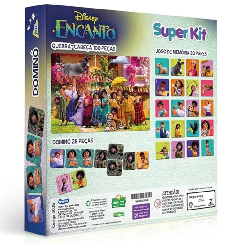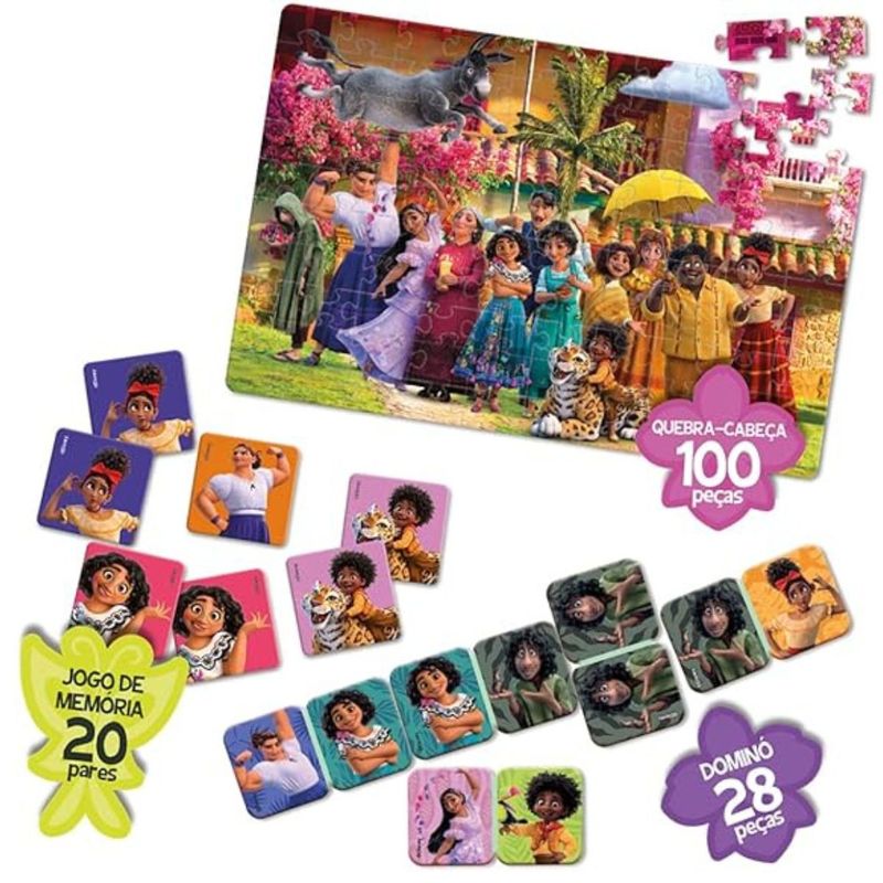 Divertido kit com quebra-cabeça 100 peças, jogo de memória com 20 pares e dominó com 28 peças de Encanto!