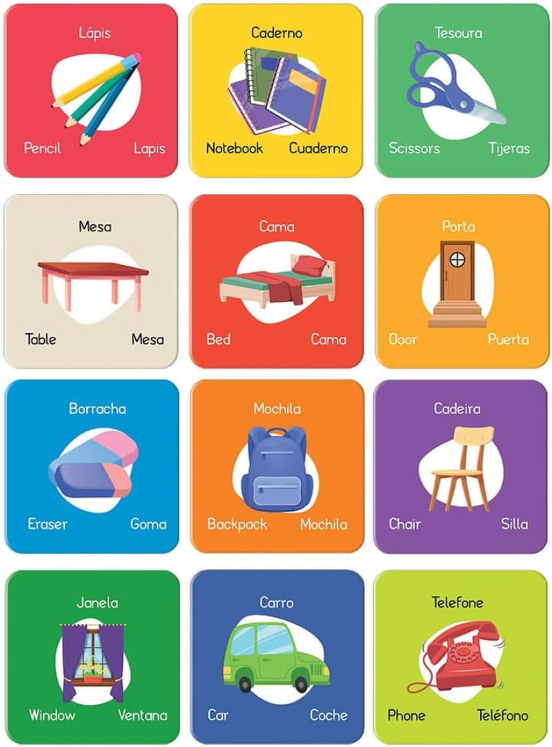 Jogo de Memória Trilíngue: Aprenda Os Nomes Dos Objetos em Português, Inglês e Espanhol Brincando de Jogo de Memória.