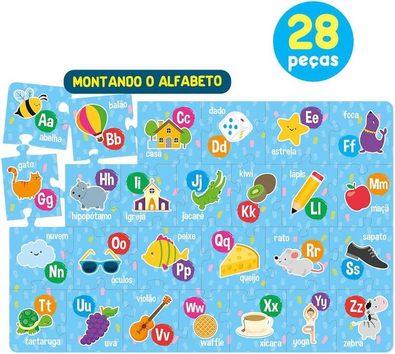 Divertido Kit com Quebra-Cabeça 26 Peças, Jogo de Memória com 12 Pares e Dominó com 28 Peças, Para Ensinar o Alfabeto, Os Números e Palavras em Português, Inglês e Espanhol!