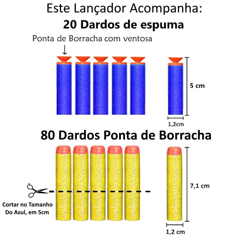 Dardos: Acompanha 100 dardos, sendo 20 com Ventosa e 80 com Pontas Emborrachadas ( Este modelo precisa cortar em 5cm para Encaixar no lançador)