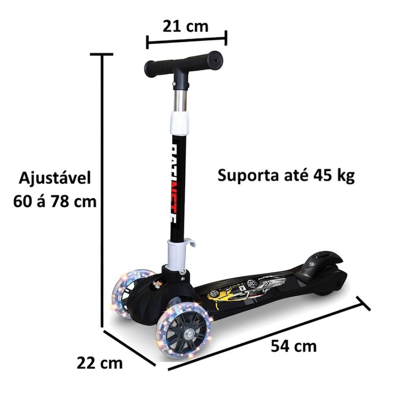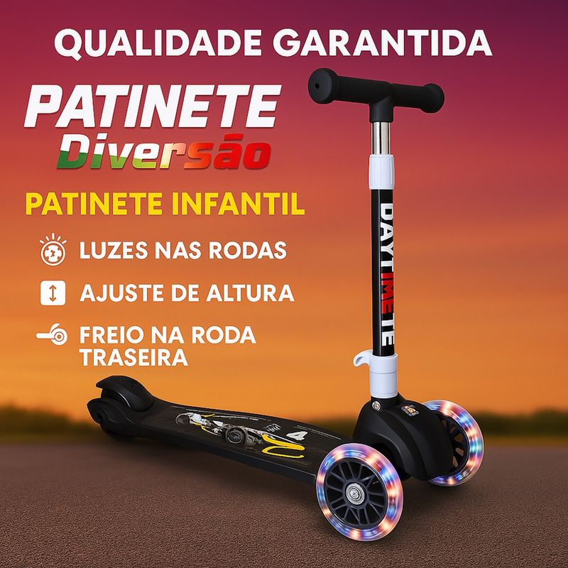 O Patinete Divertido, além de ser seguro, estimula a coordenação motora e o senso de equilíbrio das crianças. Possui ajuste de altura, freio traseiro e luzes nas 3 rodinhas quando se movimenta. É muito fácil montar, desmontar, transportar e guardar. É fabricado em metal super resistente com toda segurança do certificado INMETRO. Ótima opção de presente criativo e divertido, as crianças vão adorar!
