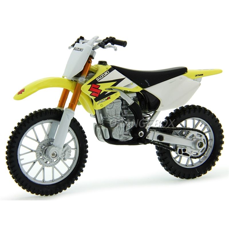 Miniatura Suzuki RM-Z250 Maisto 1:18Miniatura fabricada em plásticoProduto novo, na embalagem originalMiniatura em escala 1:18, com 12cmSuspensão na roda traseiraPneus de borrachaGuidon ativoTanque e rabeta feito em metal