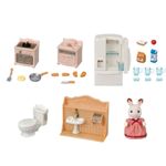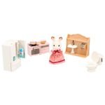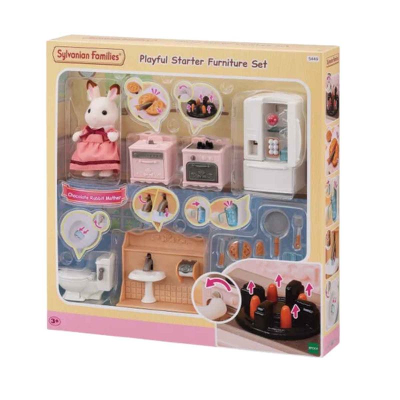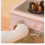 O Conjunto Primeiros Móveis Divertidos da Sylvanian Families permite que você gire a maçaneta do fogão para revelar uma chama. Coloque a torta de maçã ou baguete na mesa de corte e corte-a com a faca. Coloque uma xícara no dispensador de gelo da geladeira para fazer o gelo sair. Abra a torneira da pia para que a "água" saia. Puxe a alça do vaso sanitário para "dar descarga".