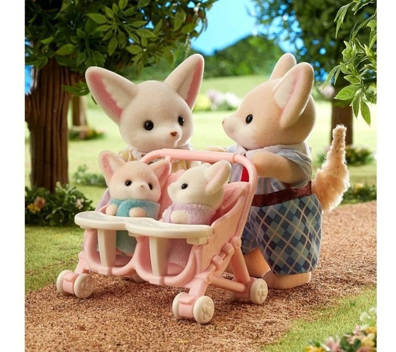 Conjunto contendo a Família das Raposas-do-deserto, conhecidos em toda parte por suas orelhas grandes e pontudas. Inclui o Papai Raposa-do-deserto, a Mamãe e os Bebês de berço, junto de um carrinho de passeio para gêmeos.