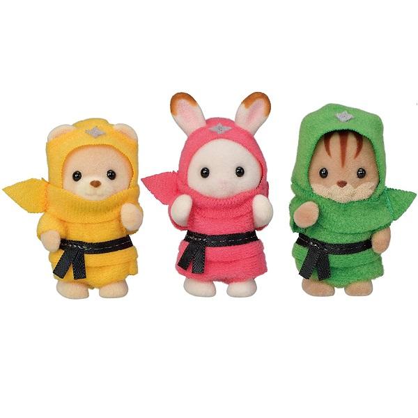 O conjunto Baby Trio (Ninja) contém três figuras de bebês vestindo roupas de ninja.