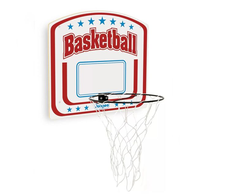Tabela de Basquete da Junges em madeira de MDF 9mm, com aro reforçado de 33 cm de diâmetro e rede em nylon 9 alças. Pintura atóxica com impressão em serigrafia.