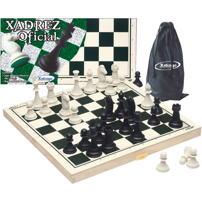 Jogo de xadrez oficial com tabuleiro em madeira e peças de plástico cumbadas e com feltro, também um saco em tecido para guardar as peças. Acompanha regras básicas do jogo.