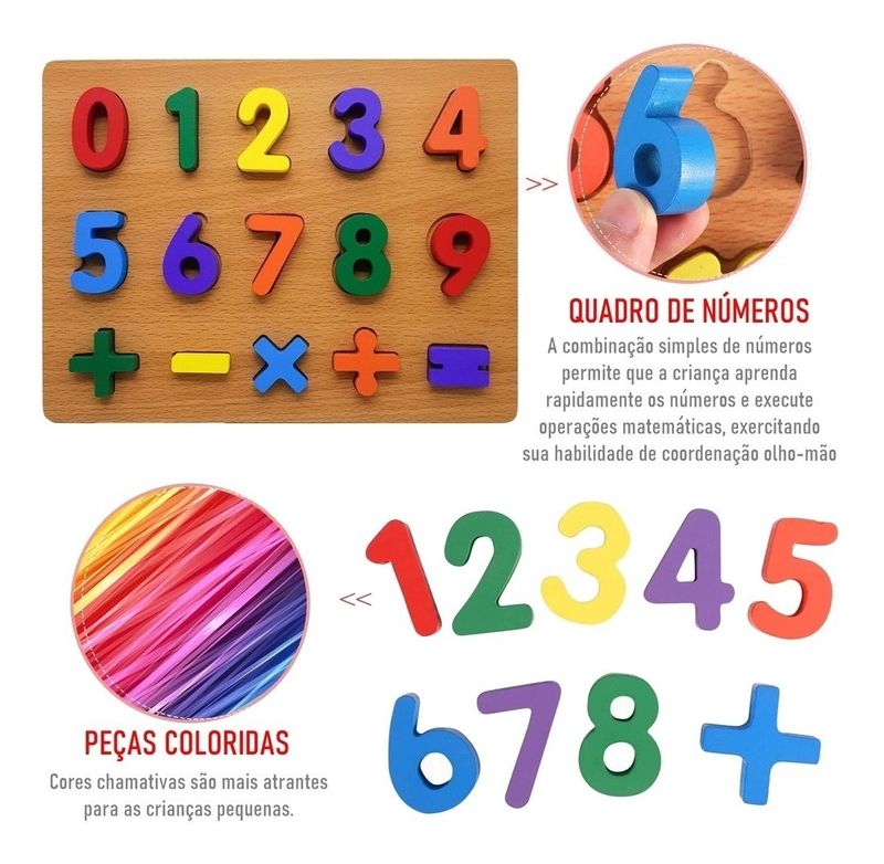 APRENDA BRINCANDO CORES E NÚMEROS - DM TOYSCores e Números da Dm Toys foi projetado para cultivar a habilidade de raciocínio das crianças, identificação de cores, números e o aprendizado de operações matemáticas básicas. É bom para desenvolver a coordenação olho-mão, habilidades motoras finas e incentivo à criatividade.Contém 15 peças com cores brilhantes, fácil de atrair a atenção das crianças, feitos de madeira natural, tratados com segurança e revestidos com tinta não tóxica, em tamanho grande e seguro para as crianças.A linha didáticos da Dm Toys tem como objetivo promover a aprendizagem e o desenvolvimento das crianças por meio de experiências lúdicas, interativas e construtivas.Os brinquedos de aprendizagem precoce são muito importantes para o crescimento das crianças. Desenvolve a coordenação motora, estimula o raciocínio, e a percepção visual de forma divertida.ESPECIFICAÇÕES:- Recomendado a partir de 3 anos- Dimensões da base:- Comprimento: 30 cm- Altura: 23 cm- Contém 15 peças- Linha: Didáticos- Marca: Dm Toys- Referência: DMT5730- Certificado de Segurança: INMETRO
