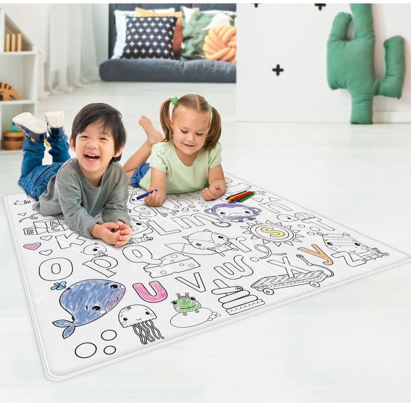Pinte e apague quantas vezes quiser os desenhos que estampam o tapete fofinho, feito em PVC, e deixe a imaginação fluir solta.