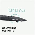 DESIGN SLIM Geometria superior da chave curvada com uma forma naturalmente arqueada e suporte de apoio para as mãos ajustável integrado que promove uma posição neutra do pulso em um design fino com teclas de baixo perfil Uma altura de 1,5