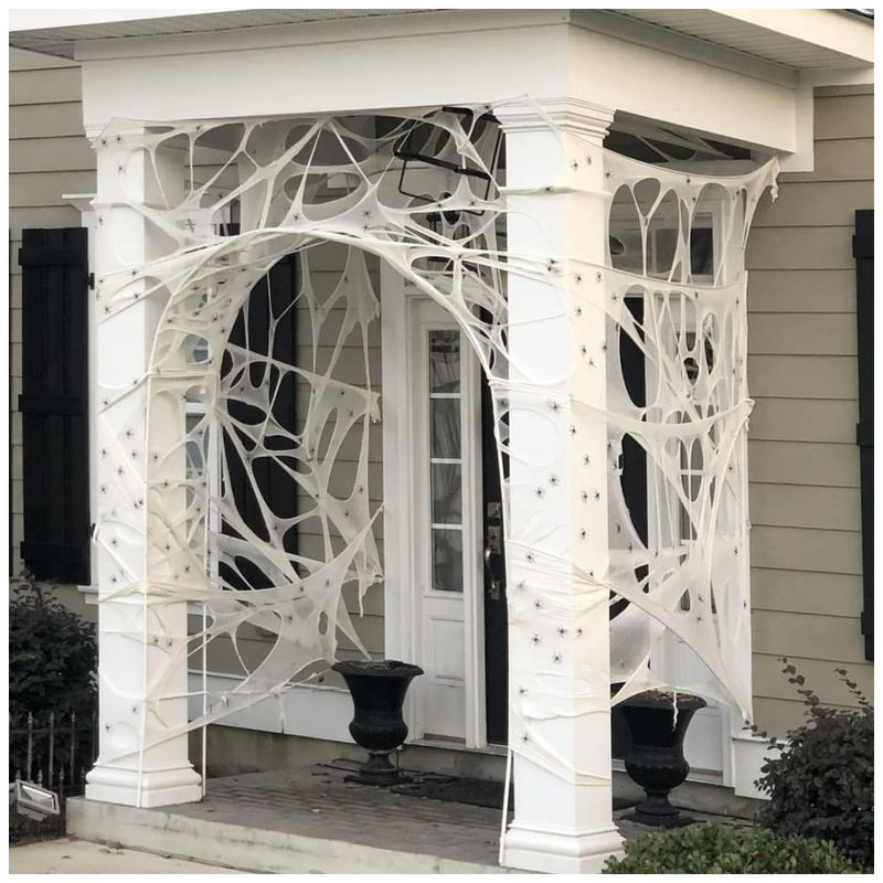 Decorações de Halloween espetaculares ao ar livre: Apare sua casa mal assombrada com essas teias de aranha que são super fáceis de incorporar às suas ideias de decoração de Halloween. Os acessórios na imagem NÃO estão INCLUÍDOS.
