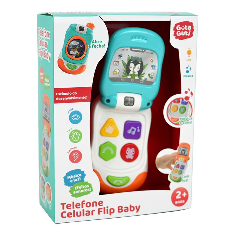 O Telefone Celular Flip Baby é muito divertido! Tem música, luz, efeitos sonoros, ele abre e fecha, deixando a brincadeira ainda mais legal!