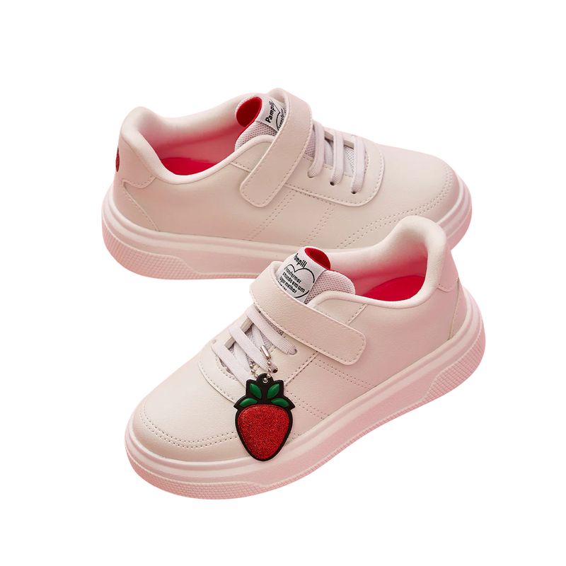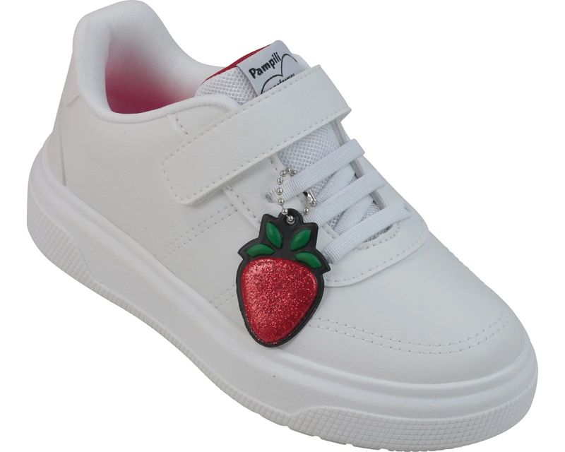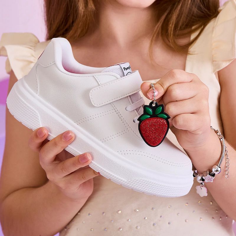 Tênis Infantil Pampili Morango Branco O Tênis XP24 é a escolha ideal para as meninas que adoram unir conforto e doçura com estilo e um toque de fofura! Com design moderno e versátil, ele traz um visual apaixonante e solado caixa super leve, que garante estabilidade e liberdade para brincar o dia todo. O charme especial fica por conta do detalhe bordado e pingente removível em formato de morango do amor, um doce ícone que é a cara da Pampili e encanta em cada detalhe. O pingente também pode ser usado como acessório! Ideal para looks casuais ou aquele passeio especial, possui fechamento prático com material aderente e cadarço elástico. Forro macio e palmilha confortável. Solado com identificação em braile para ajudar as meninas cegas ou com baixa visão. Aposte! Perfeito para escola, passeios ou momentos de lazer, esse tênis combina com roupas leves e casuais.