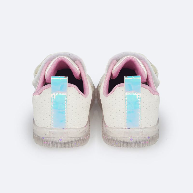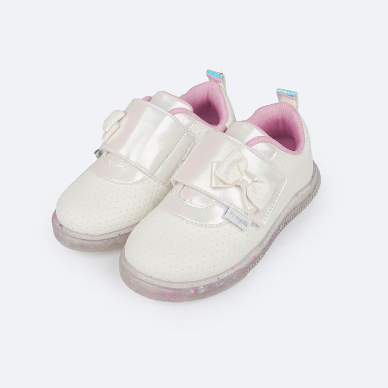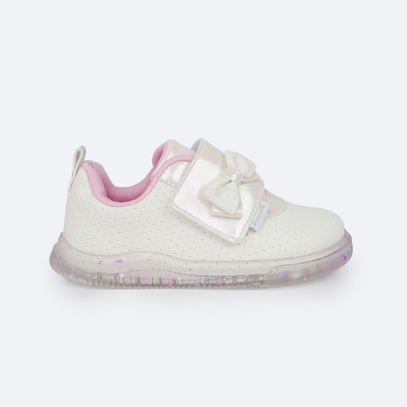 Tênis infantil feminino em sintético branco com perfuros, detalhes perolados e laço duplo, moderno e delicado! Tênis feminino com forro interno que auxilia na absorção do suor e espuma macia no calcanhar. Palmilha Feet Care que possui um sistema avançado de fofura, com a densidade ideal para os pés, minimizando impactos. Tênis com calce fácil em velcro, dando autonomia para as meninas e facilitando o calce para as mamães. Tênis de solado translúcido com glitter em TR que apresenta muita aderência e estabilidade, além da flexibilidade, resistência térmica e alto desempenho.