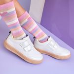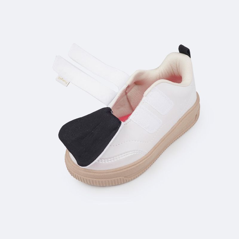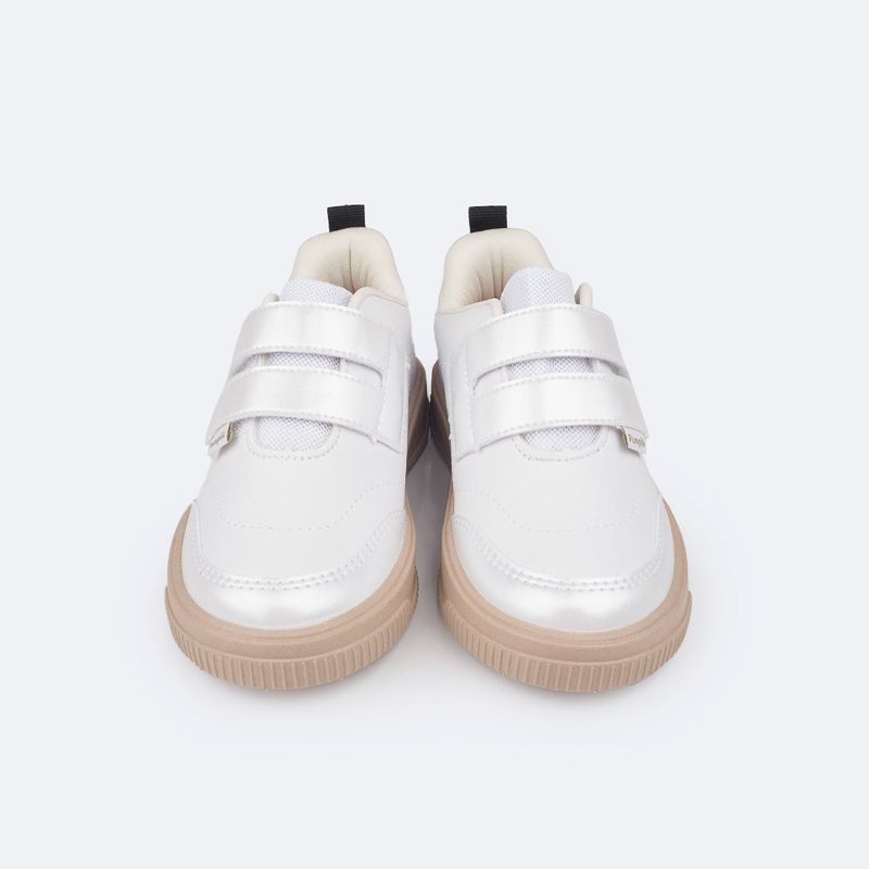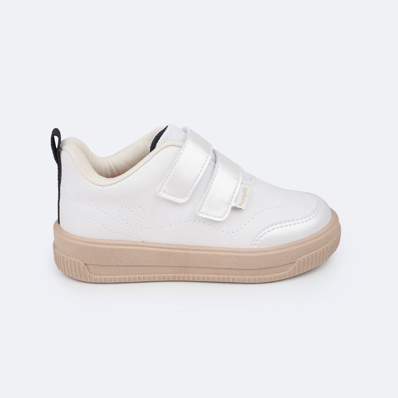 Tênis escolar infantil em sintético branco com recortes perolados e bordado de coração no cabedal, fofo e delicado para acompanhar a menina em sua rotina escolar! Tênis infantil com forro interno que auxilia na absorção do suor e espuma no calcanhar, além de possuir palmilha anatômica, trazendo um super conforto para os pezinhos durante o uso na escola ou passeios. Tênis escolar feminino com solado micro expandido, material leve com muita aderência e estabilidade, além da flexibilidade, resistência térmica e alto desempenho antiderrapante. Tênis fácil de calçar através de velcro duplo, dando autonomia para a menina.