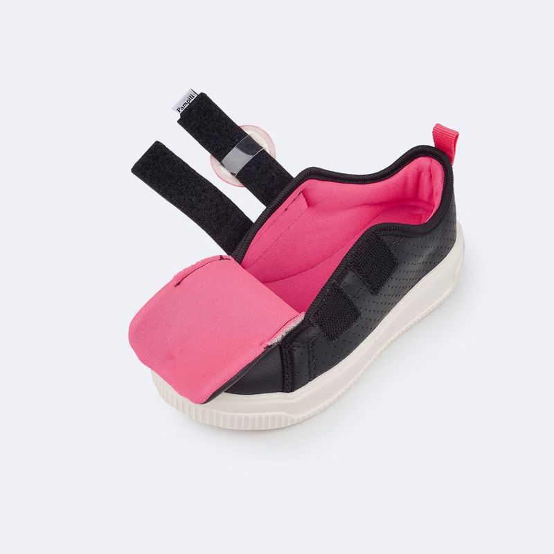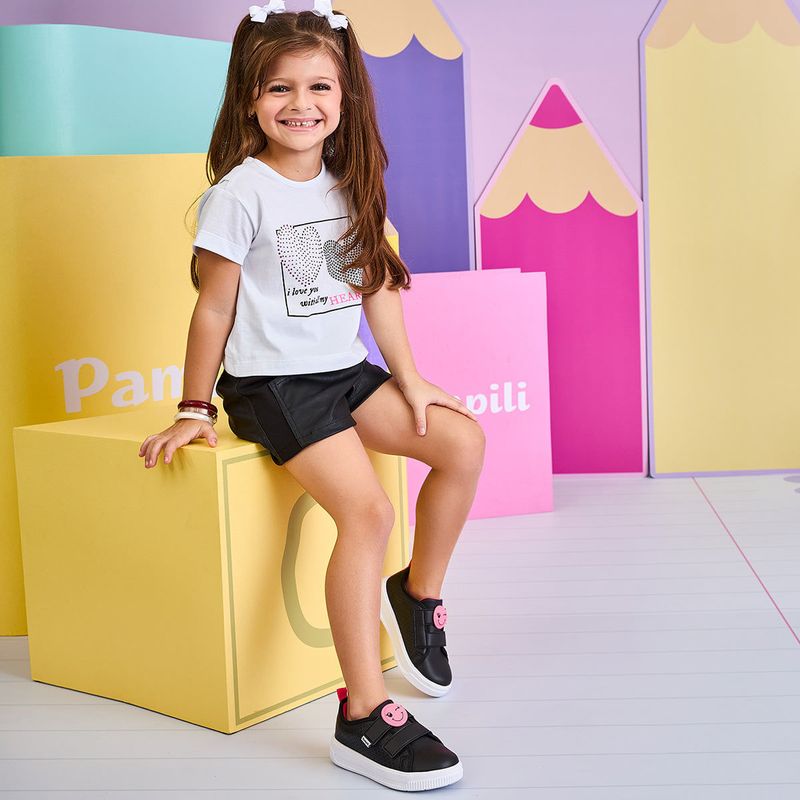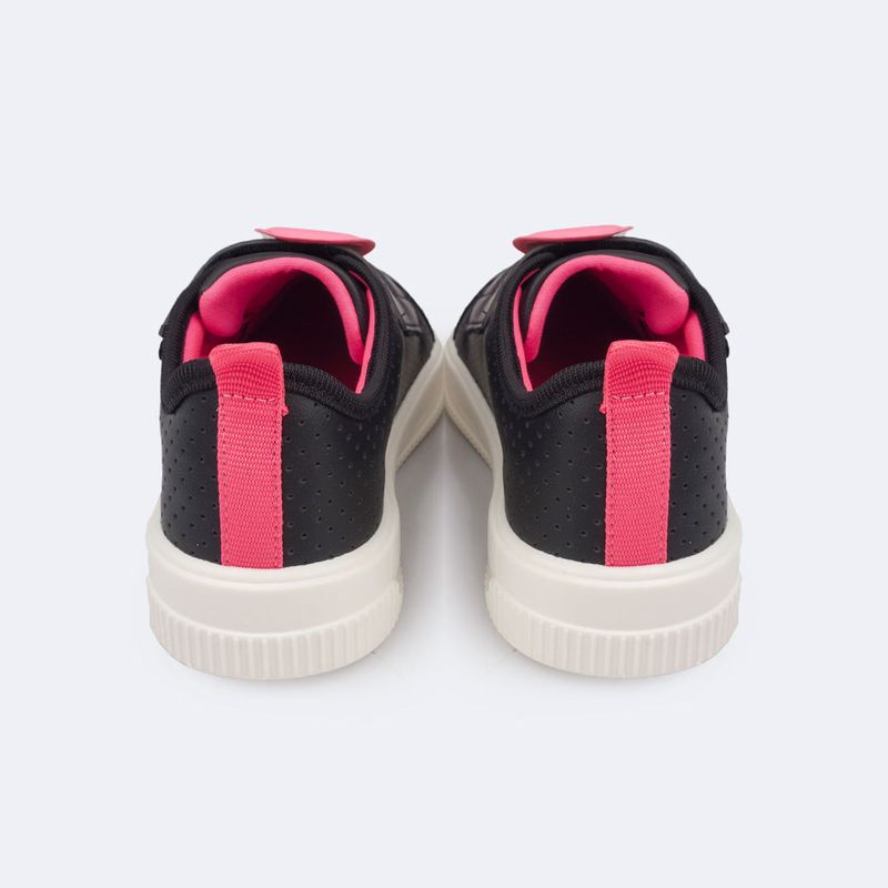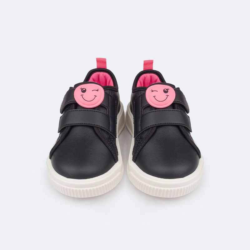 Tênis escolar infantil em sintético preto com perfuros e patch removível de carinha, fofo e divertido para acompanhar a menina em sua rotina escolar! Tênis infantil com forro interno que auxilia na absorção do suor e espuma no calcanhar, além de possuir palmilha anatômica, trazendo um super conforto para os pezinhos durante o uso na escola ou passeios. Tênis escolar feminino com solado micro expandido, material leve com muita aderência e estabilidade, além da flexibilidade, resistência térmica e alto desempenho antiderrapante. Tênis fácil de calçar através de velcro duplo, dando autonomia para a menina.