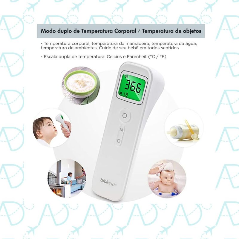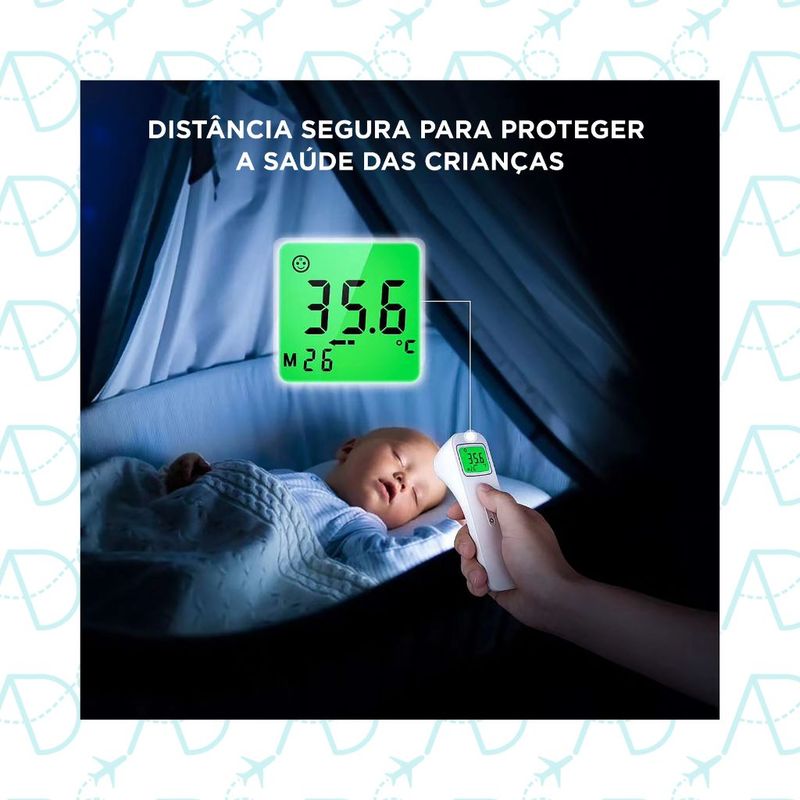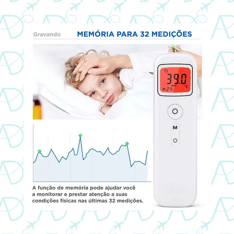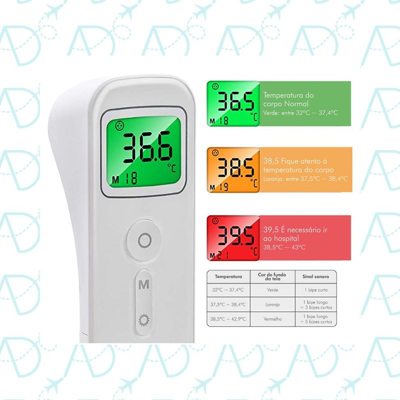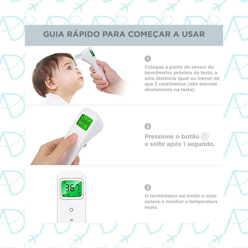 - Utilização na testa - Medição a distância com precisão clínica (1-5 cm) - Visor com indicação de febre - Memória das 32 últimas memórias - Indicação do nível de bateria - Desligamento automático - Manual explicativo - Mede temperatura de objetos - Leitura da temperatura em poucos segundos - Ideal para combate a COVID, pois entrega uma precisão de +/- 0.2ºC - Aprovado pela ANVISA (10410139003) e INMETRO (OCP SGS).