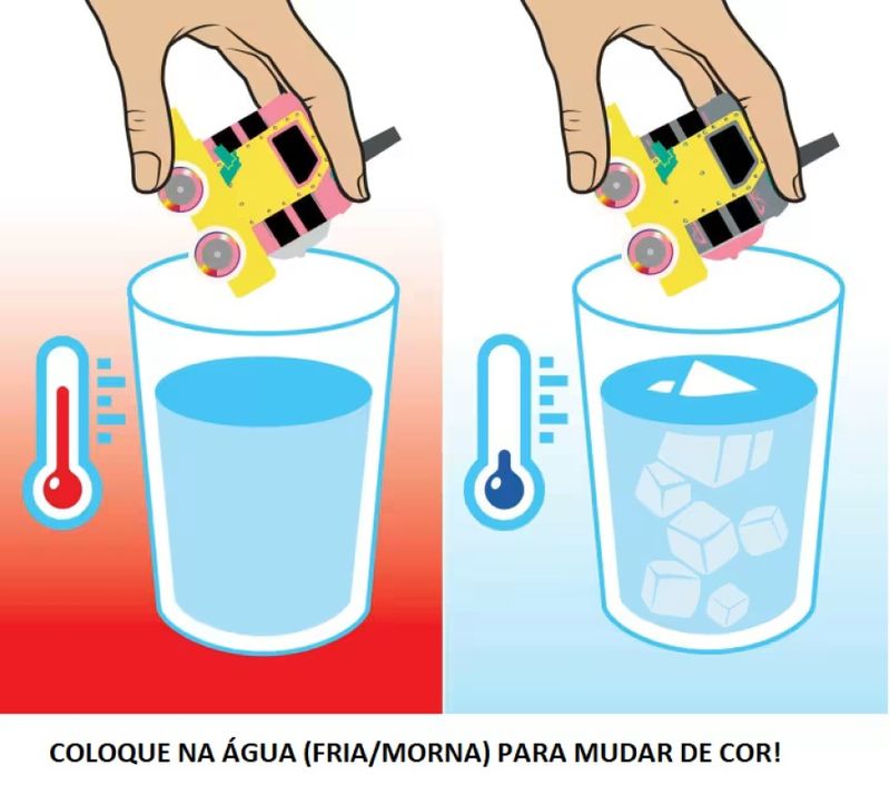 Coloque na água fria ou morna, em cada uma delas o modelo terá uma cor diferente!
