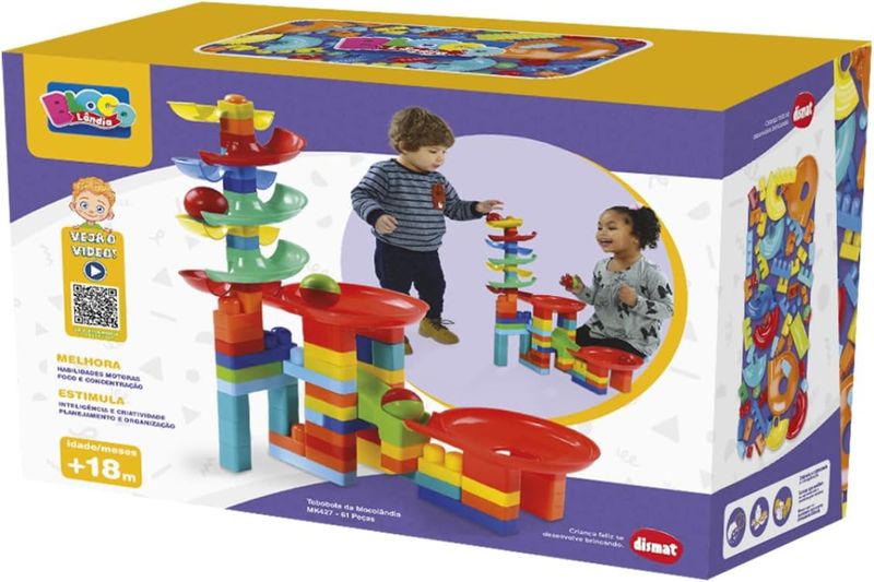 As crianças vão se divertir em dose dupla com o Tobobola da Blocolândia. São 61 peças para brincar de montão. Além de brincar montando o Super Circuito peça a peça, as crianças também são estimuladas a movimentarem a bolinha pela rampa.