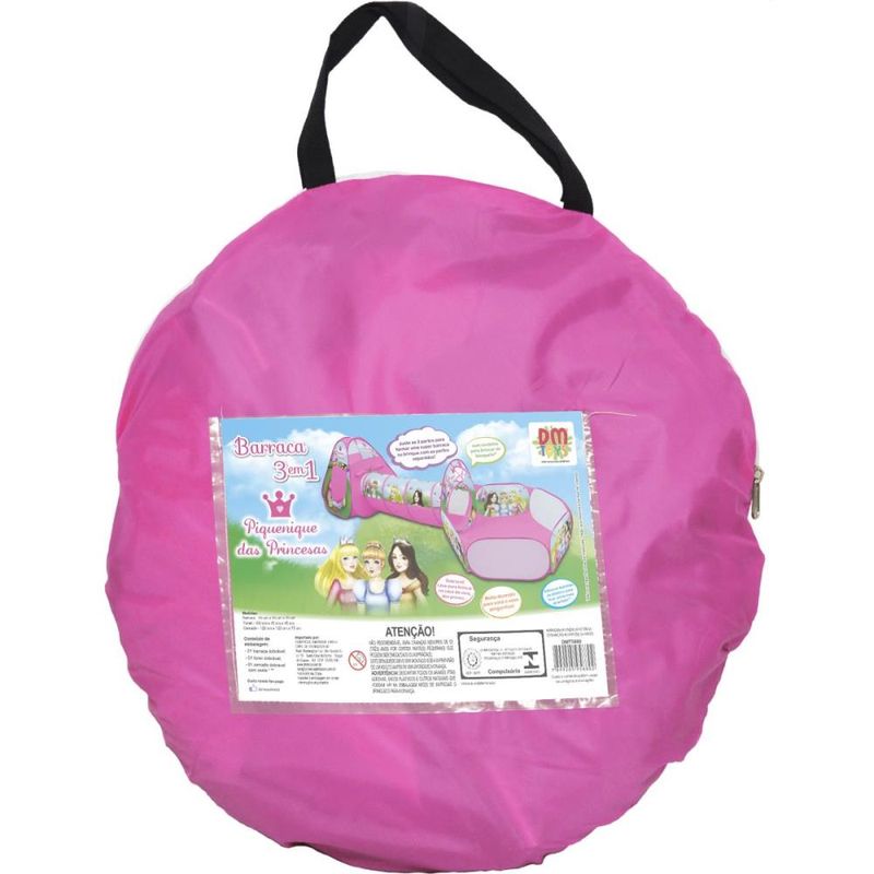 A Barraca 3 em 1 Princesas é muito legal! Junte as 3 partes para formar uma super barraca ou brinque com as partes separadas. Ela vem com uma cestinha de basquete e você pode adicionar bolinhas de plástico (não inclusas) para deixar ainda mais divertido. Ela é dobrável, fácil de armar e não ocupa muito espaço na hora de guardar. Medidas: - Barraca: 95x95x95cm - Túnel: 150x45x45cm - Cercado: 120x120x75cm