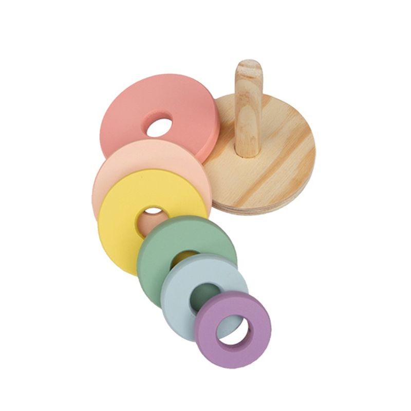 Torre de empilhamento contendo base e seis peças coloridas.