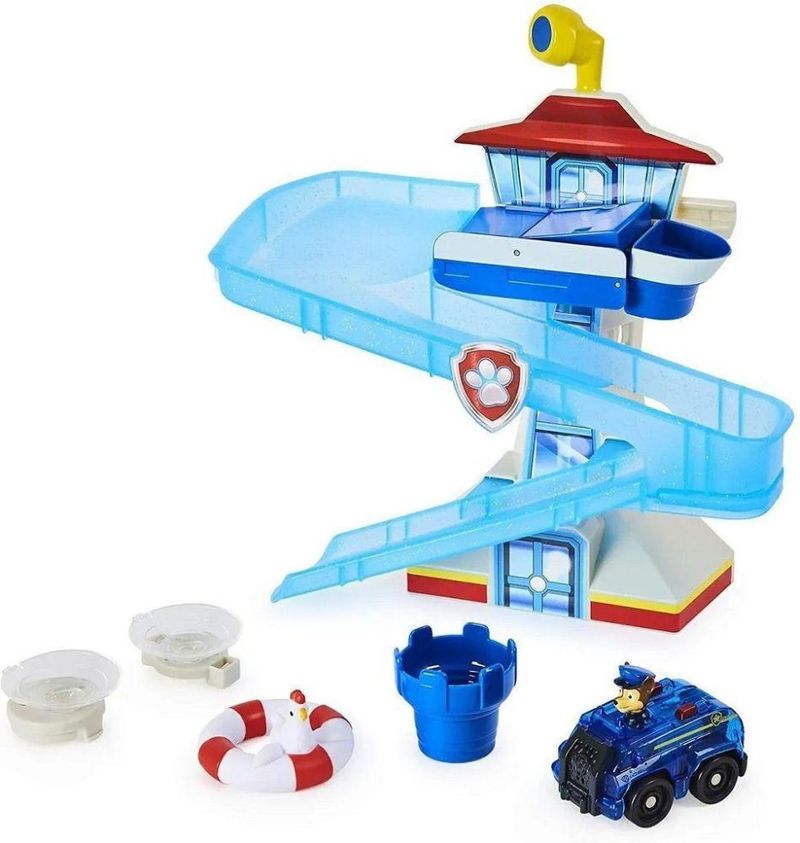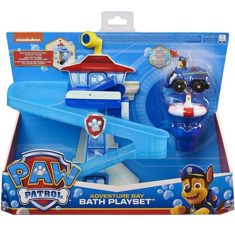 Corra para o resgate com Chase e seus amigos da Patrulha Canina em Adventure Bay Bathing. Com a torre Adventure Bay, um veículo Chase que brilha no escuro e uma figura de Chickaletta que flutua, a hora do banho agora se torna uma hora de brincar também. Graças às ventosas na parte de trás, você pode facilmente colar o conjunto de brinquedos nos ladrilhos e o conjunto permanece no lugar. Quando Chickaletta tem problemas durante o banho, você correr para salvá-la. Coloque Chase (inteiro com seu veículo) no topo da torre e use o copo para encher o topo com água. Chase desliza seu veículo para fora da pista para salvar Chickaletta. O veículo acende-se assim que entra na água. Resgate Chickaletta e use sua imaginação para c suasiar suas próprias aventuras de resgate da Patrulha Canina no banho. Inclui 3 baterias tipo botão em embalagem try-me. Conteúdo: 1 Playset PAW Patrol Adventure Bay Bath, 1 Veículo de perseguição, 1 Figura Chickaletta, 1 Copo de água, 2 Ventosas e Guia de Instruções