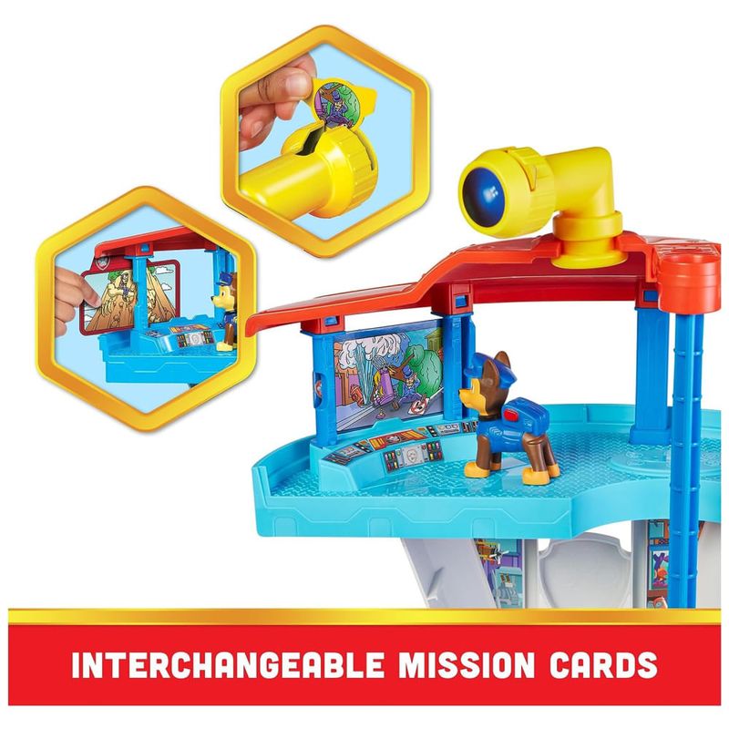 Depois de selecionar seu cartão de missão, escolha um dos 3 cartões de periscópio de dupla face, para visualizar através do periscópio da torre, para saber aonde ir. Quando chegar a hora de um resgate superalimentado, deslize Chase pelo escorregador da torre para pular diretamente para a viatura policial de Chase, antes de bater no lançador de veículo para entrar em ação.