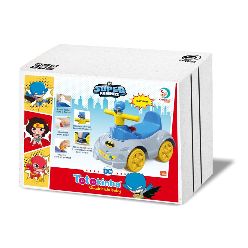 Totokinha Quadriciclo Baby Batman com BonecoMarca: Cardoso ToysMaterial: PlásticoMedidas: 50 cm x 37 cmIdade recomendada: Acima de 18 Meses.Suporta Crianças de até 40 Kg.A Totokinha Quadriciclo Baby Batman com Boneco da Cardoso Toys é um brinquedo didático, lúdico e muito divertido! Desenvolvido para crianças na fase da primeira infância, ela possui funções didáticas que auxiliam no desenvolvimento, aprendizado e nos primeiros passos. É nessa fase que a criança mais precisa de estímulos para desenvolver suas aptidões. A Totokinha Quadriciclo Baby Batman vem com um boneco de vinil do personagem, marcha e chave com som de “crec-crec” e porta-malas que abre e fecha. Além do seu guidão com design ergonômico. É indicado para crianças maiores de 18 meses. Os diferenciais da Totokinha Quadriciclo Baby Batman estimulam a coordenação motora, os primeiros passos e equilíbrio do bebê. Os brinquedos da linha Totoka foram projetados para uma brincadeira segura, confortável, educativa e alegre! A Totokinha Quadriciclo Baby Batman com Boneco é da coleção Totoka da Cardoso Toys! Cardoso Toys. Porque brincar faz bem!