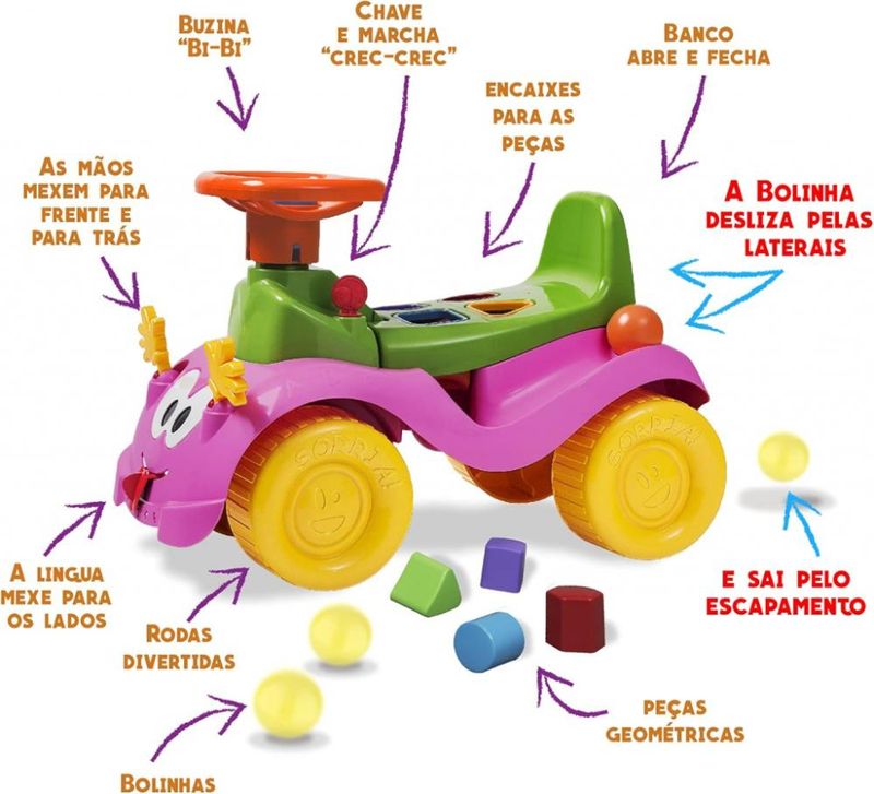A Totokinha Bolinha Rosa é um andador didático ideal para crianças a partir de 12 meses. Fabricada em plástico resistente e atóxico, ela estimula os primeiros passos e o desenvolvimento motor de forma lúdica. Os diferenciais incluem:Escorregador de bolinhas nas laterais: a criança coloca a bolinha, que escorrega por baixo do assento e sai pelo escapamentoFormas geométricas para encaixar no bancoBuzina, chave e marchaMãozinhas que se movem com som de “crec crec” e língua articuladaPorta-malas para guardar brinquedosSuporta até 40 kg??? Conteúdo da embalagem:1 Totokinha Bolinha Rosa2 bolinhas4 formas geométricas coloridas\n\nIdade recomendada:12-18 meses;Composição/Material:Plástico;Funciona com pilhas:Não;Brinquedo com luz:Não;Brinquedo com som:Não;Dimensões:51,7x36x28 cm;Peso:2,1 kg;Código de Barras:7896484130332;Garantia do Fornecedor:3 Meses contra defeito de fabricação