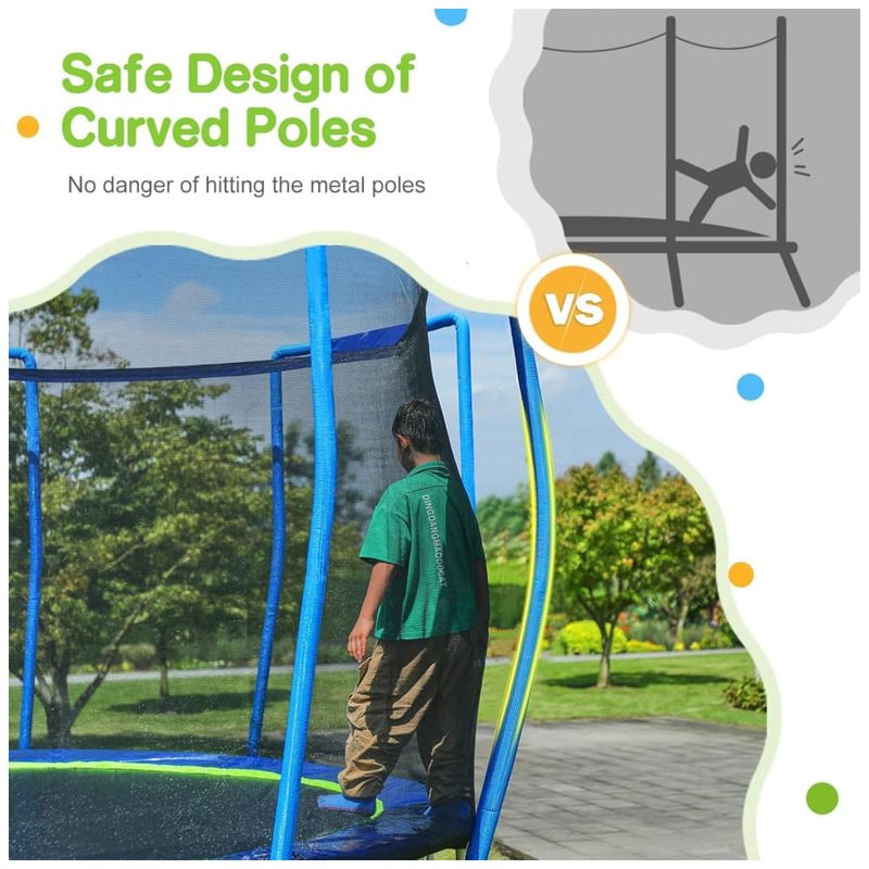 O design inclui 96 molas, oferecendo um salto impressionante. A rede de segurança de 1,8 m de altura, feita de PE ecológico, garante total proteção durante os saltos. Os postes da rede são revestidos com espuma de 10 mm, protegendo as crianças de batidas.