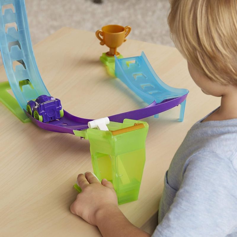 O destaque desta pista é o loop vertical, que permite que o veículo dos Transformers Rescue Bots realize manobras impressionantes enquanto corre pela pista.