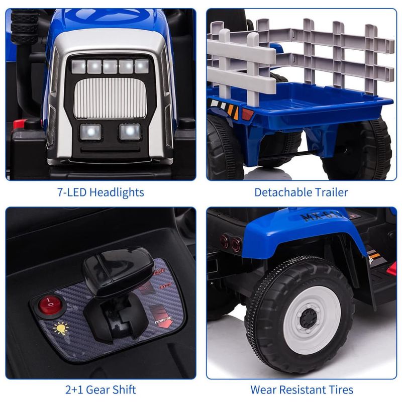 O desempenho do carro elétrico foi aprimorado com um potente motor de 12V e pneus de tração que permitem que as crianças andem em terrenos complexos, como grama e cascalho. Ele também possui faróis brilhantes de 7 LED, uma mudança de marcha realista de 2 marchas, cinto ajustável e trailer removível para um estilo realista.
