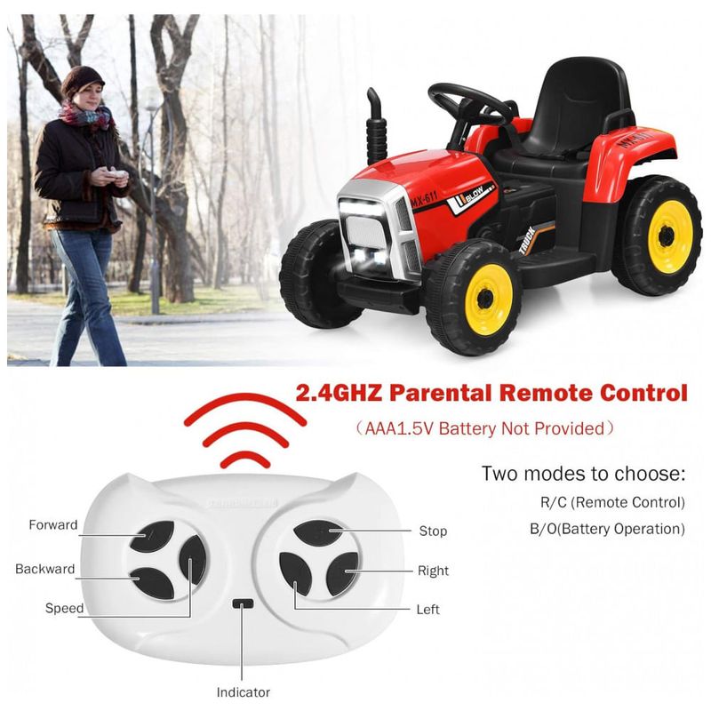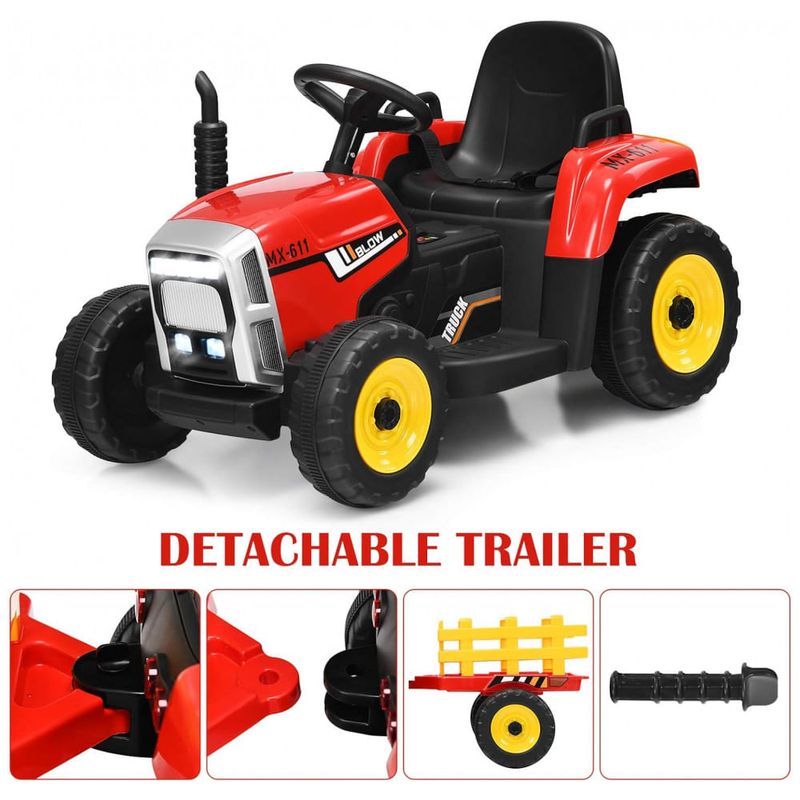 O OLAKIDS 12V kid 2 em 1 é um trator com reboque que proporciona aos seus pequenos um prazer de condução superior e verdadeira diversão. O reboque é removível, sólido e durável, e os faróis LED brilhantes e som de inicialização oferecem um estilo realista.