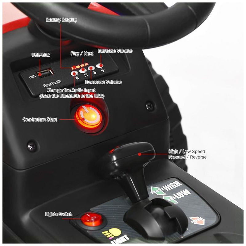 O carro Rideon vem com controle remoto de 2,4 GHz, permitindo que as crianças dirijam manualmente ou os pais controlem com segurança. A porta USB e o Bluetooth integrado permitem que você se conecte ao seu dispositivo e reproduza sua própria música.