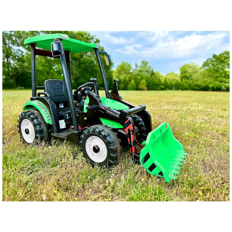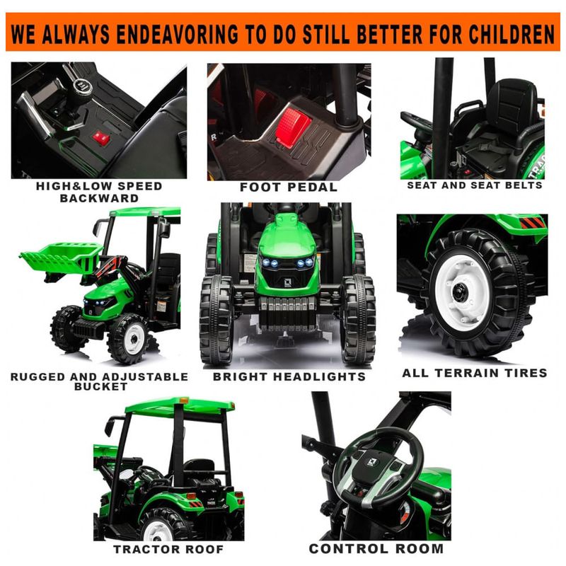 Trator infantil 24V com carregador frontal: Crianças andam em trator equipado com carregador frontal. O carregador frontal em funcionamento recolhe, levanta, carrega e despeja do banco do condutor. Ao andar neste trator, as crianças podem limpar o jardim com os pais e aproveitar o tempo feliz entre pais e filhos.
