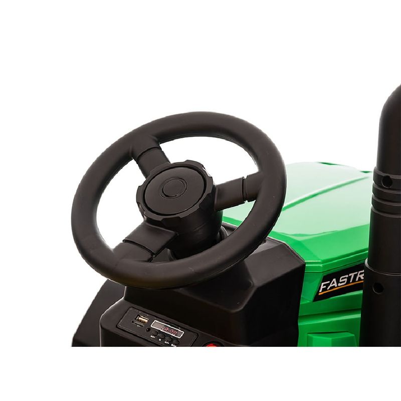 Trator Elétrico Infantil com Controle Remoto 12v Zippy Toys O Trator Elétrico com Carretinha da Zippy Toys é uma réplica detalhada de um trator real, com cores vibrantes e acabamentos que capturam a essência de um veículo agrícola autêntico, tornando a brincadeira muito mais divertida. Ideal para os pequenos que amam explorar a natureza, ele proporciona uma experiência de pilotagem suave e potente, adequada para diversos tipos de terrenos. Com duas formas de brincar, ele possibilita que criança pilote como um trator de verdade ou com o adulto controlando através do controle remoto. Equipado com bateria de 12V recarregável, ele possui sons de buzina, ronco de motor e seu reprodutor de música integrado tem entrada para cabo auxiliar e USB. Os faróis em LED acendem de verdade, o câmbio possui duas marchas (frente e ré) e, sua carretinha é removível. Desenvolvido com foco na segurança, ele possui cinto de segurança subabdominais, assento confortável e apoios de braços articulados. Além disso, seu pedal conta com uma aceleração gradual e frenagem confiável. Mais do que uma simples forma de entretenimento, ele desempenha um papel importante no desenvolvimento das habilidades motoras e da coordenação das crianças. Ao conduzir o Trator, elas praticam a destreza e a concentração, promovendo o aprendizado de forma lúdica e ativa ao ar livre. Cada volta e cada aceleração ajudam a desenvolver a confiança e a independência. Com esse Trator Elétrico, a diversão é garantida em todos os momentos! Principais Características: