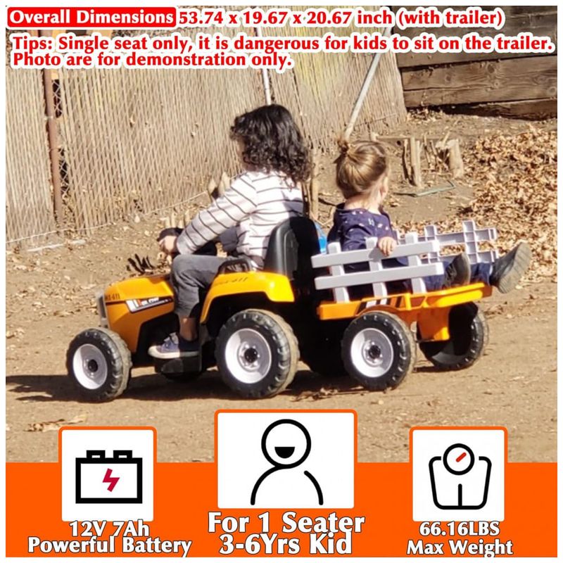 O trator também possui um reboque removível que permite às crianças transportar brinquedos, bonecas, grama, palha, e desfrutar de momentos de lazer. Você pode remover o trailer para armazenar convenientemente. O trator vem com algumas músicas infantis e você pode conectar seus dispositivos ao trator para tocar músicas ou histórias favoritas de seus filhos, aumentando o prazer de dirigir. Há um indicador de bateria no painel. Este carro de passeio é fabricado com um corpo de plástico PP durável e é um presente perfeito para crianças no Dia de Ação de Graças, Natal, Ano Novo, etc.