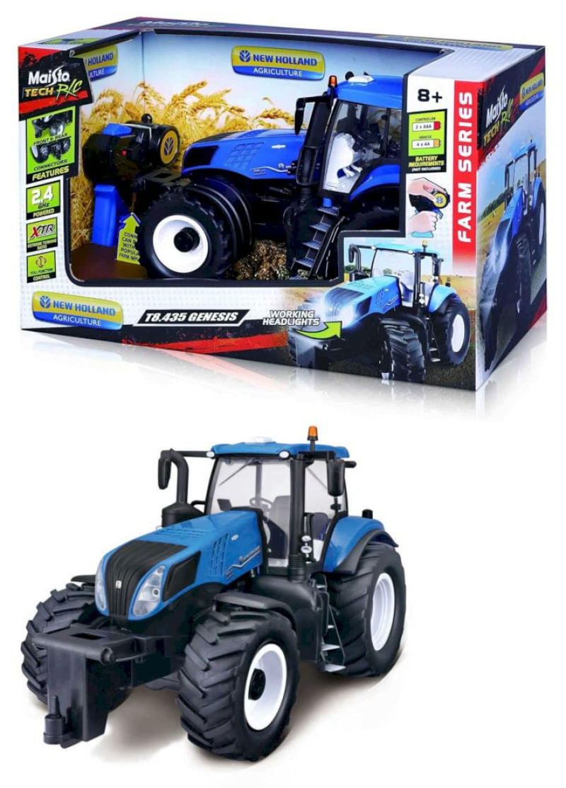 Trator T8.435 Genesis New HollandMarca do produto: Maisto.Coleção: Maisto Tech R/C - Farm SeriesTamanho: Aproximadamente 32 cm de comprimento.Pneus de Borracha.Controle Remoto com função total. Frequência 2.4Ghz.Funciona com 4 pilhas AA para o veículo e 2 pilhas AAA para o controle (não inclusas)