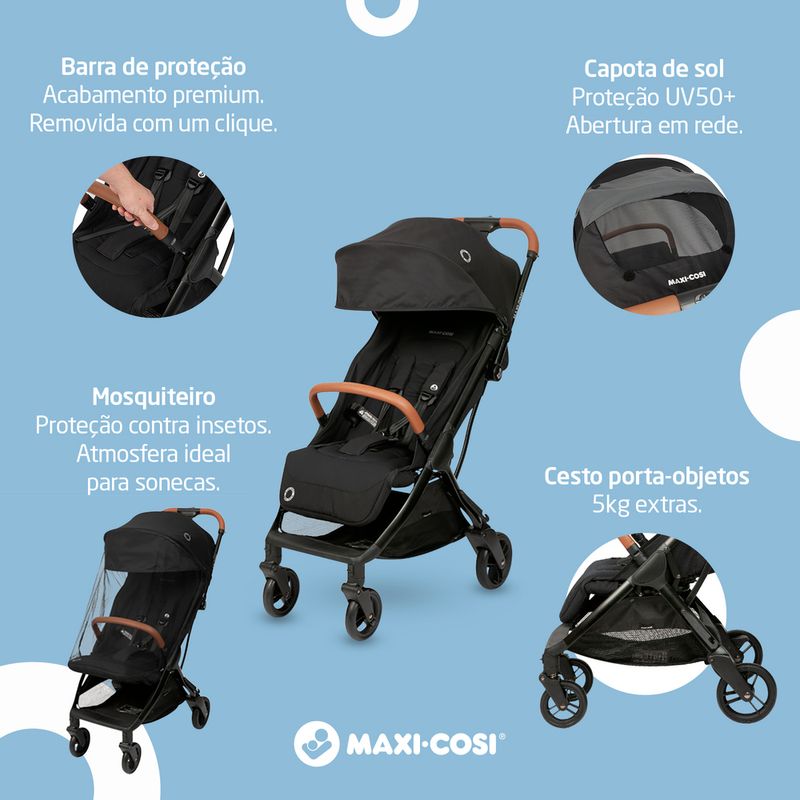 Compacto e com fechamento automático! O carrinho que faltava para pais que precisam de praticidade, sem abrir mão do conforto do bebê. Conjunto acompanha bebê conforto Pebble 360 e base veicular giratória ISOFIX FamilyFix 360. É possível ser compacto e confortável ao mesmo tempo? A resposta é sim, com o carrinho Eva Maxi-Cosi. Com fechamento automático, ele se fecha com apenas uma das mãos, garantindo toda praticidade que a vida moderna exige. O Eva TS TRIO ISOFIX 360 é completo: carrinho, bebê conforto Pebble 360 e base veicular giratória FamilyFix 360 ISOFIX. Ideal desde o nascimento, com assento extremamente confortável e totalmente reclinável, em múltiplas posições, e o apoio dos pés também ajustável, para modo berço ou passeio. Os bebês crescem rápido e o carrinho Eva foi desenvolvido para acompanhá-los perfeitamente em todas as fases. É testado e certificado para até 22kg de peso segundo as normas européias. Acompanha mosquiteiro, que barra a luz excessiva. O carrinho é compacto, com alça de ombro para carregar; ocupa pouco espaço no porta-malas e é aceito como bagagem de mão na maioria das aeronaves. Possui capota ampla, com visor, aba de sol rebatível e proteção UV50+. Conforto e facilidade também para dirigir, com suspensão nas 4 rodas, freio único e rodas dianteiras com giro 360° e trava, além de cesto porta-objetos com capacidade para 5 kg