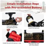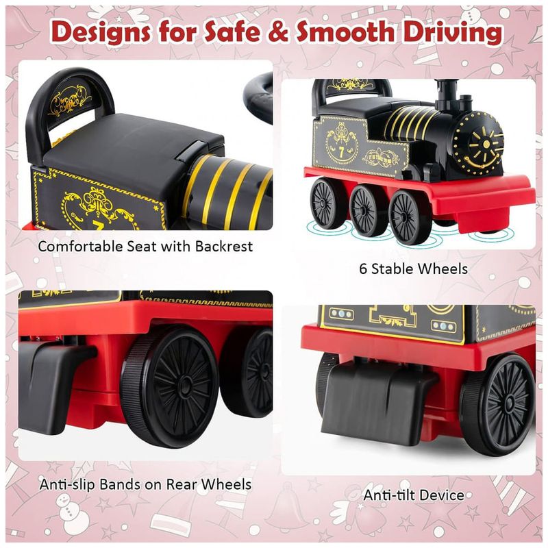 Este brinquedo de passeio de trem elétrico tem apitos de trem realistas e luzes coloridas, o que torna a condução mais divertida. E para uma condução confortável, as crianças podem colocar os pés nos pedais retráteis. Além disso, a caixa escondida debaixo do assento oferece espaço de zenamento adicional para brinquedos infantis, lanches e assim por diante.