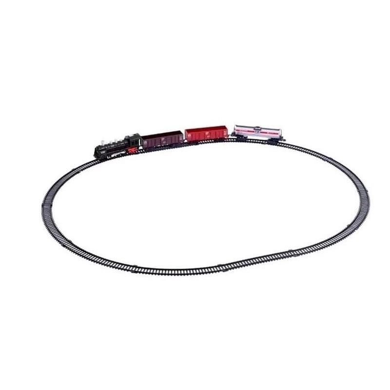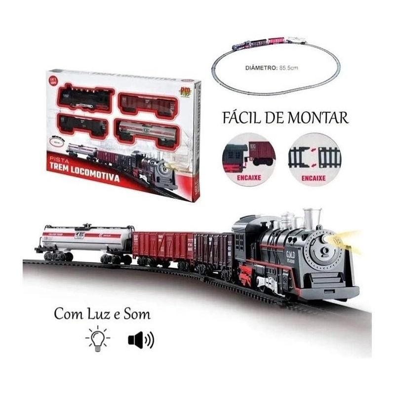 Trem Locomotiva Pista com Luz e Som, feito para seu filho se divertir, a onde ele pode embarca em varias aventuras com seu novo brinquedo o trenzinho, compre para seu filho se divertir muito com a imaginação dele, e para ter esplêndidas aventuras. Contém: 01 Locomotiva 02 vagões 10 trilhos