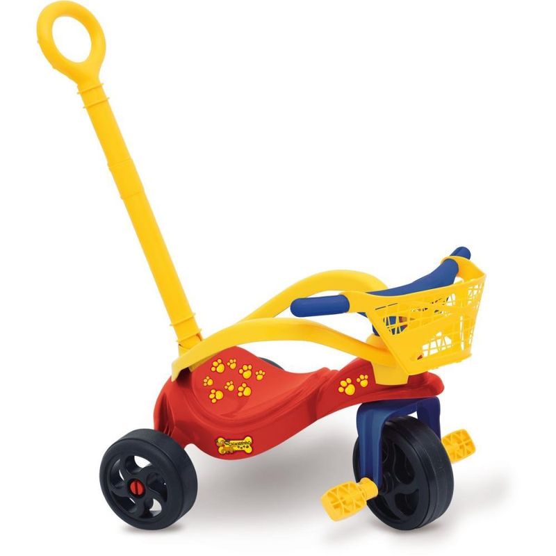 O Triciclo Cachorrinho com empurrador e cercado de proteção garante controle absoluto aos pais, deixando assim a brincadeira mais segura. O empurrador e o cercado são removíveis quando a criança pedalar sozinha é só removê-los. O triciclo t raz um design diferenciado, com a temática de bichinho de estimação e com traços que propiciam maior conforto, bem como, uma melhor estabilidade e postura para a criança. Possui um sistema de tração inovador, totalmente em plástico e é fabricado com materiais de engenharia específicos para garantir a qualidade e a resistência do produto. Este produto também possibilita o desenvolvimento da coordenação motora, equilíbrio e atenção das crianças. Indicado para crianças a partir dos 19 meses.