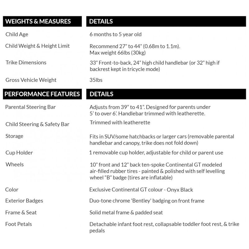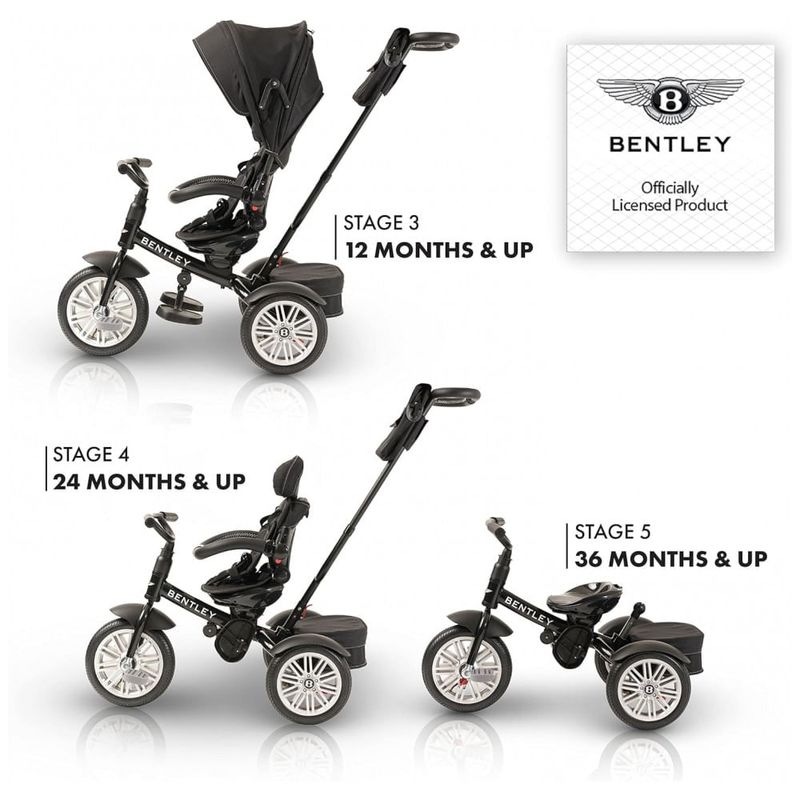 LICENCIADO OFICIALMENTE E PROJETADO PELA BENTLEY MOTORS UK Este triciclo 6 em 1 faz uma declaração ousada onde quer que você vá. Ele se transforma de um triciclo de bebê em um triciclo de criança grande à medida que seu bebê cresce de 10 meses a mais de 5 anos.