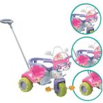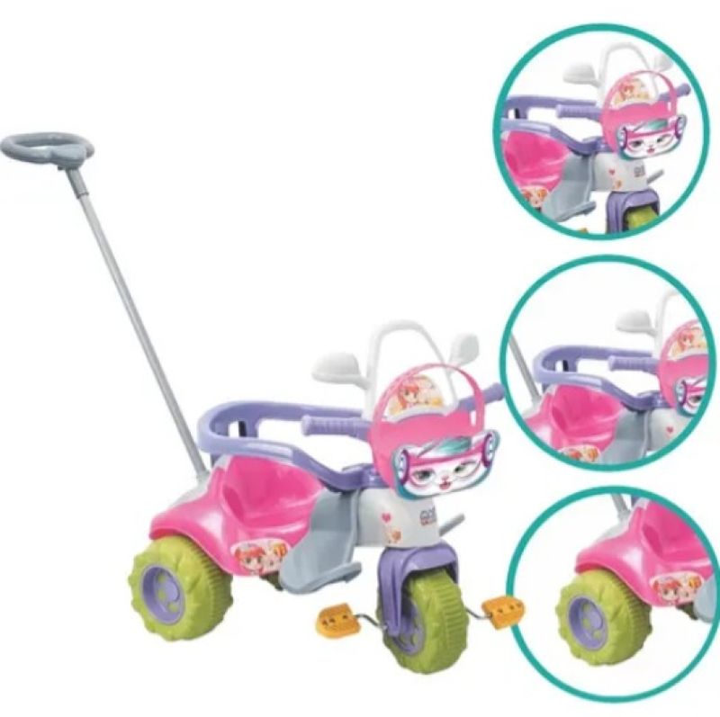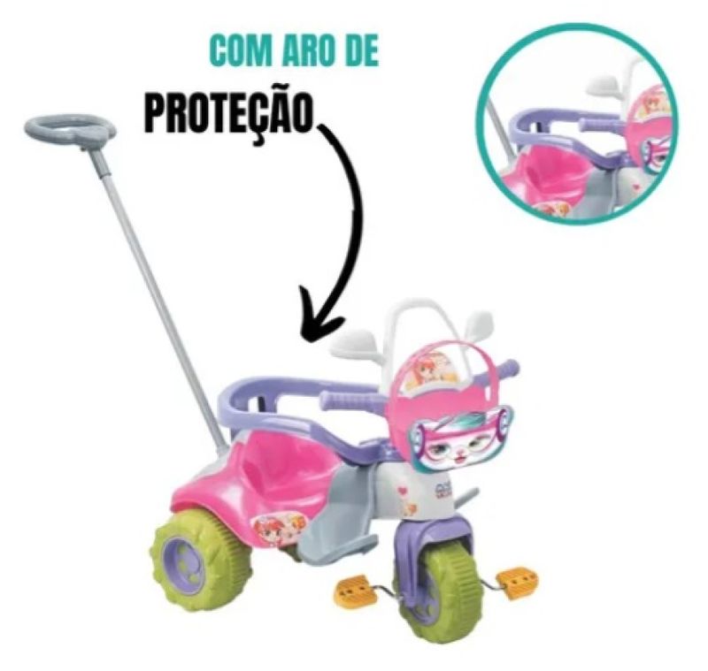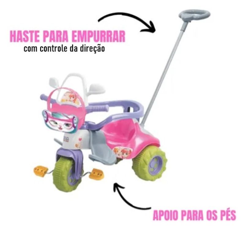 Fabricado com materiais que conferem alta resistência e eficiência ao produto. O Triciclo é companheiro ideal para as aventuras dos pequenos. Possui apoio de pés, porta acessórios, buzina sonora e empurrador. Ideal para passeios com seu filho(a) no parque, na rua, no shopping. Aproveite a chance e dê o melhor presente para a garotada se divertir de montão!