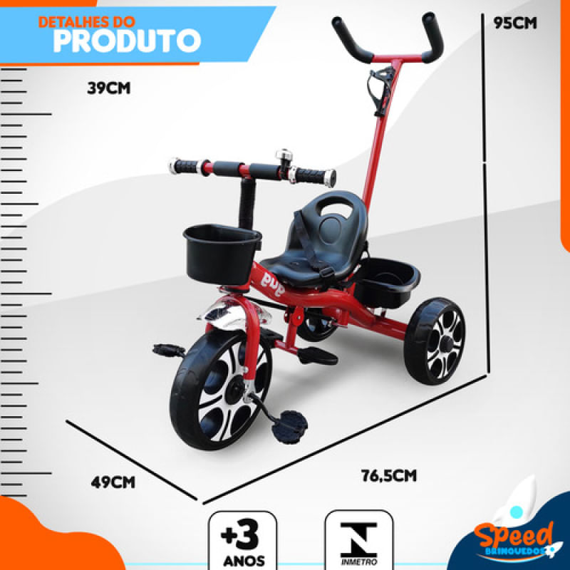 Tamanho do produto: 73x48x92 Tamanho da embalagem: 78*57*36cm Idade recomendada: 1-4 anos Material: PP, ferro Funcionalidades: Roda de EVA, com cesta Registro: 012221/2023 Certifcado: 00952/22-3